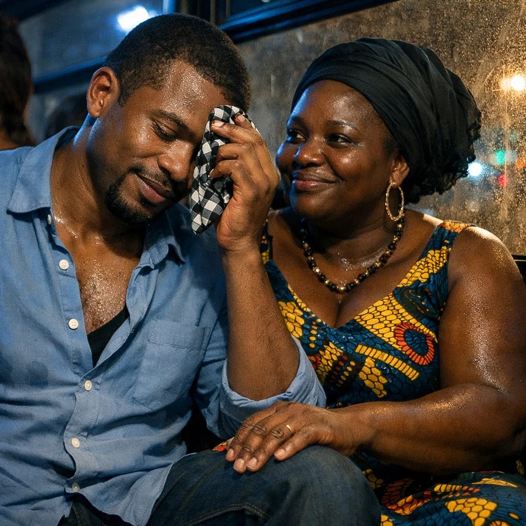 “Are you okay, my American brother?” she asked with a West African patois. She was hefty, and like his own, her skin’s dark tone had an intensity to it, reflecting the bus’s halogen blue lights. He felt each of her bulging curves pressed tightly against him with every jolt, her hips nestled up against his, radiating an unwelcome heat.